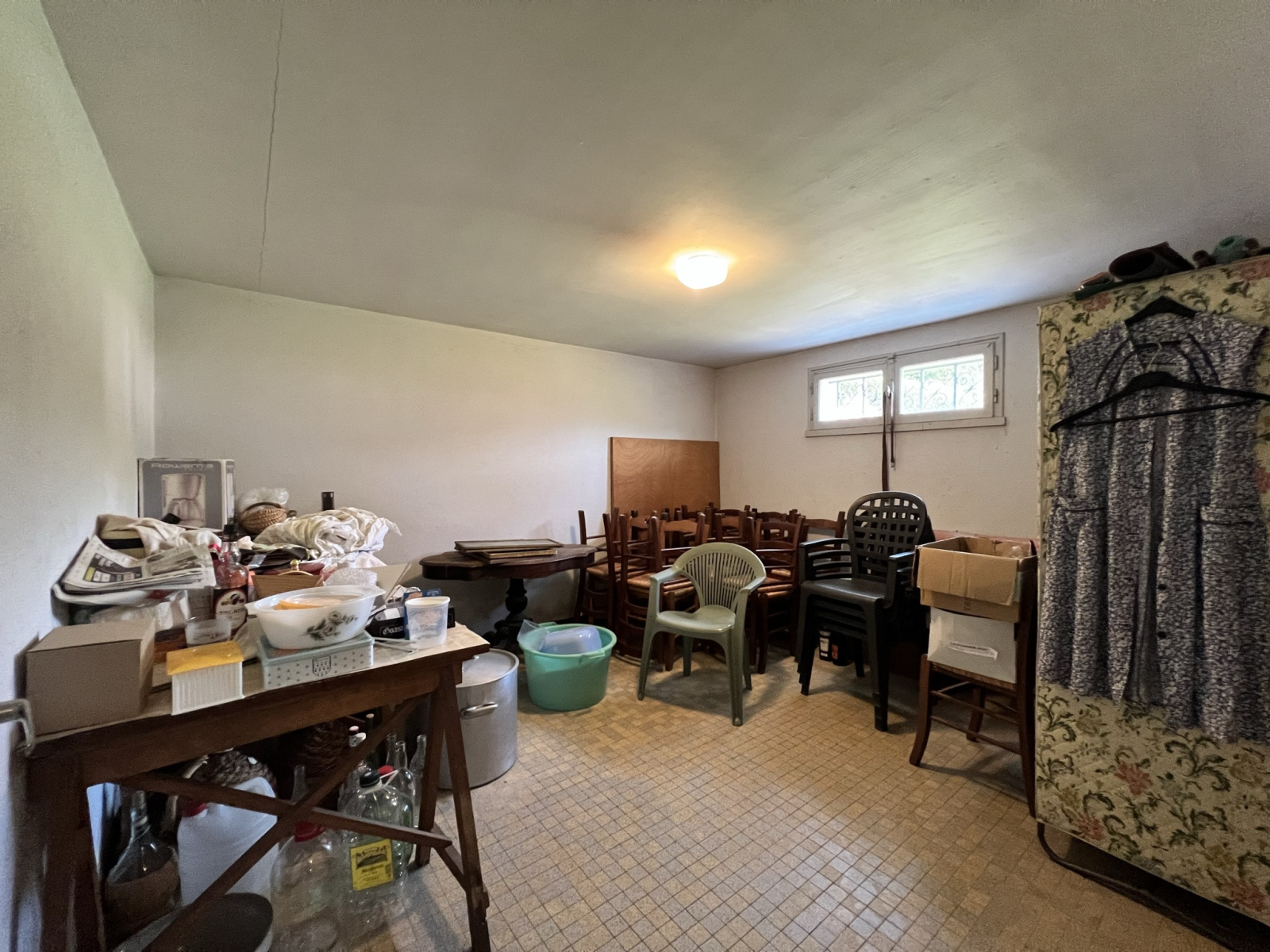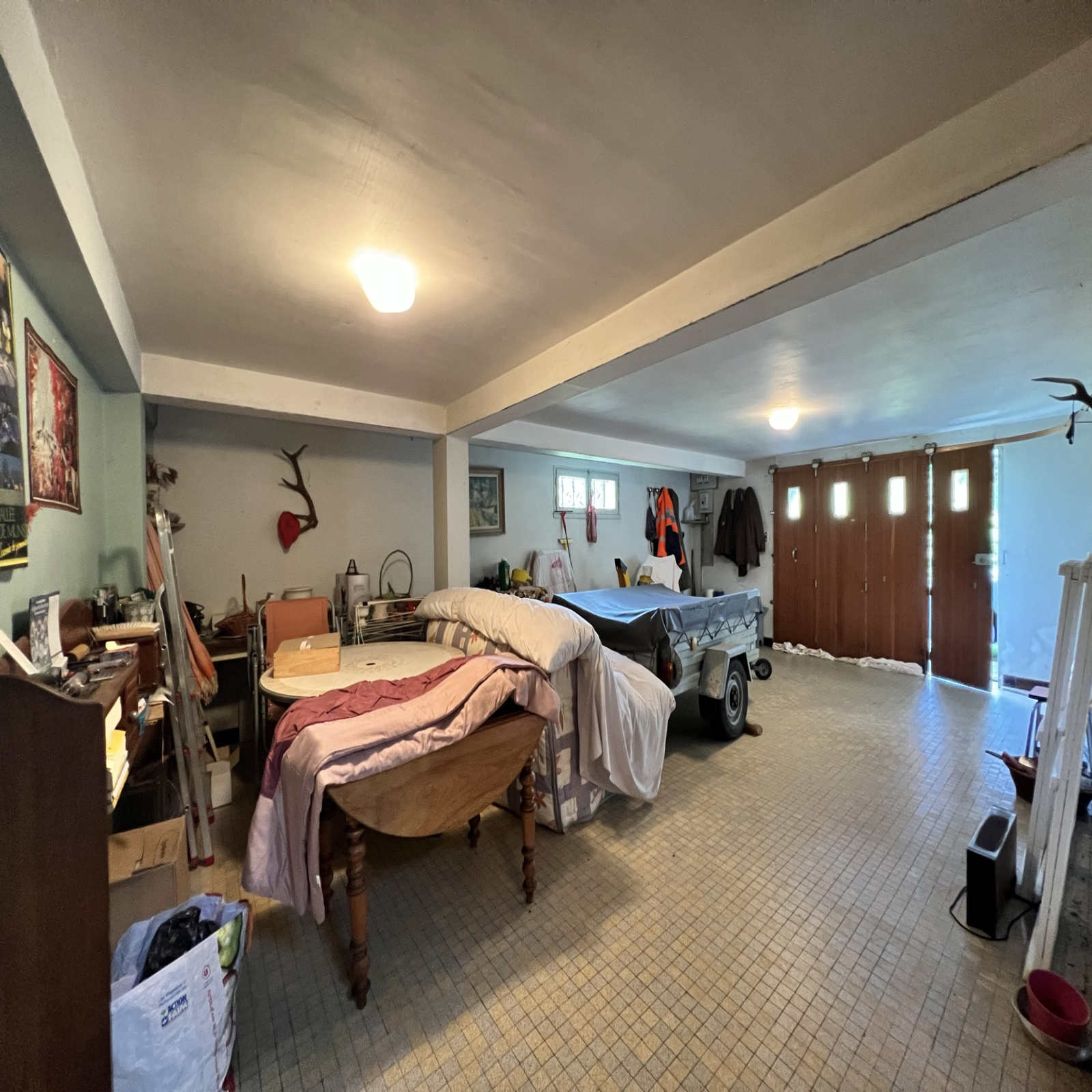 Au rez-de-chaussée, sous-sol semi-enterré d'environ 127m² comprenant une pièce avec évier et poêle à bois mirus, un grand garage de 63m², trois pièces, une salle d'eau et un wc. L'ensemble est carrelé et chaque pièce possède des ouvertures.