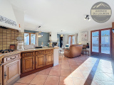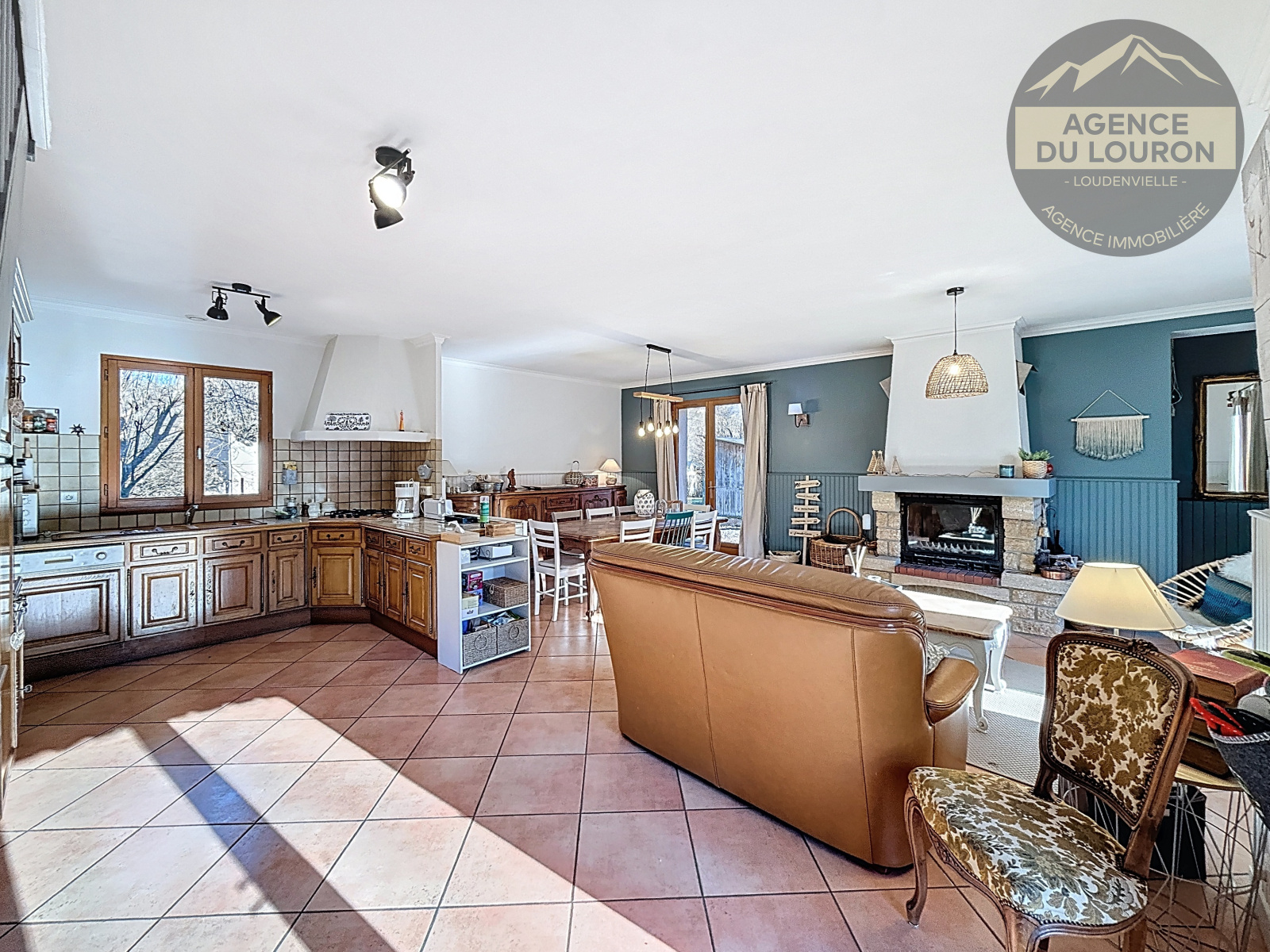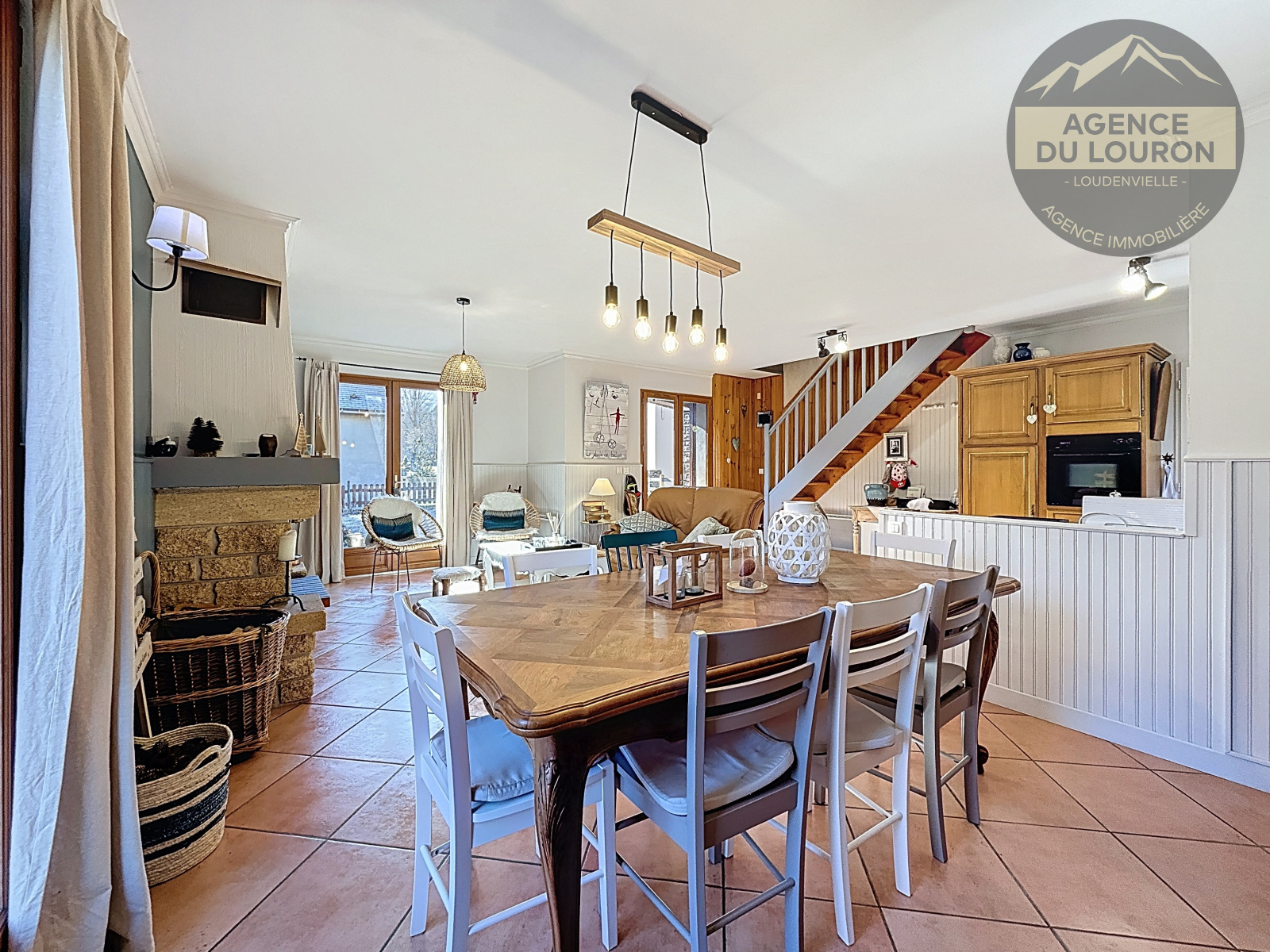 Au rez-de-chaussée,une grande pièce à vivre avec cuisine américaine, aménagée et équipée, un espace salle à manger, et un espace salon avec cheminée insert.